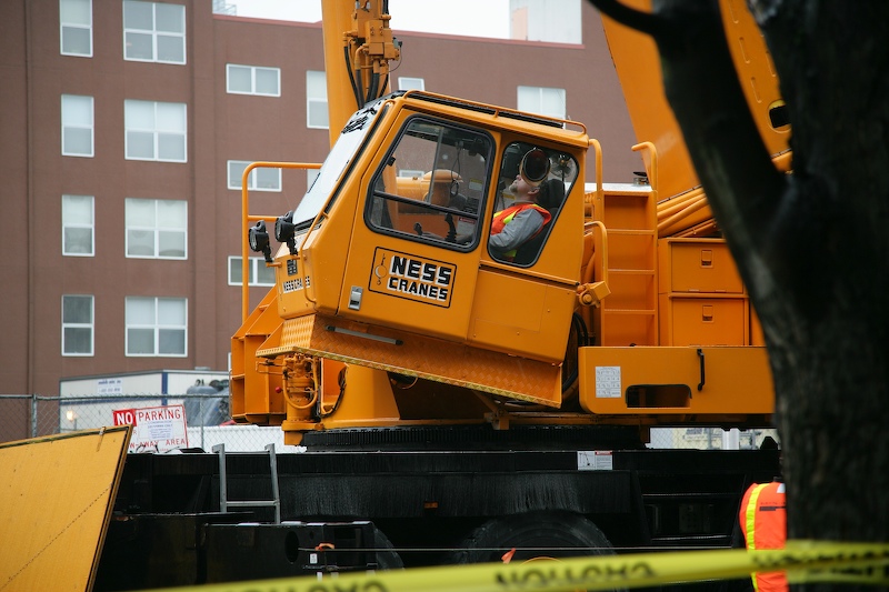 Ropes are used to steady the load as it is being lifted. Note that the crane's operator cab tilts.