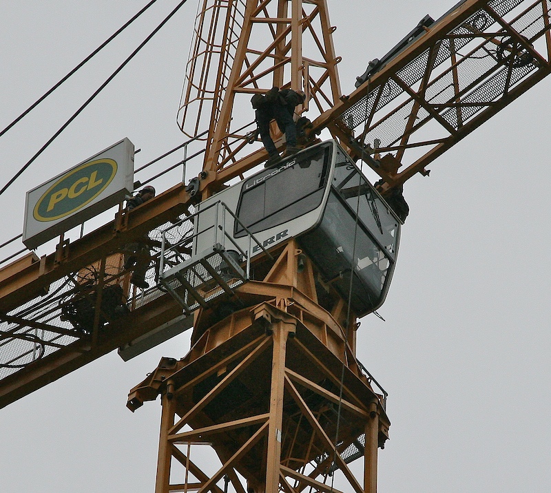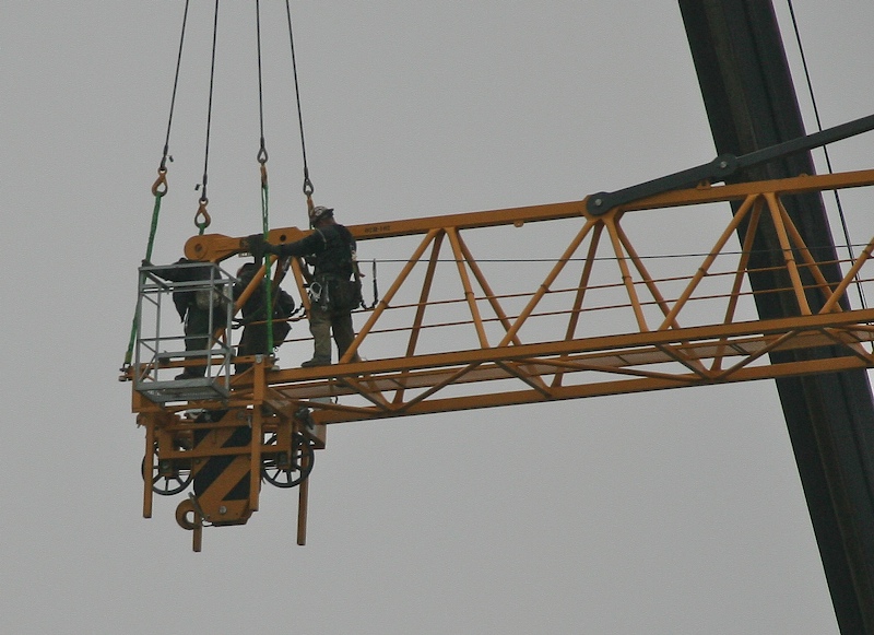 Note the assembler on top of the operator cab. The other one is on the far side of the cab. These guys are extremely exposed. True, they do have a safety line attached, but it is a long, long way down.