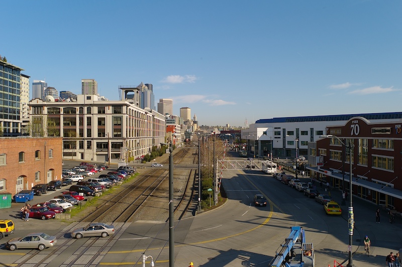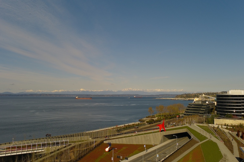 Our place has a grand view of the north end of Elliot Bay. The OSP is in the forground wiht both the Eagle and Typewriter Eraser sculptures visible. Grain ships awaiting loading are visible with the grain terminal just visible above the building with the satellite dish.
