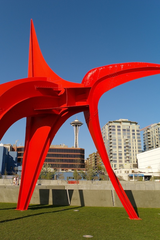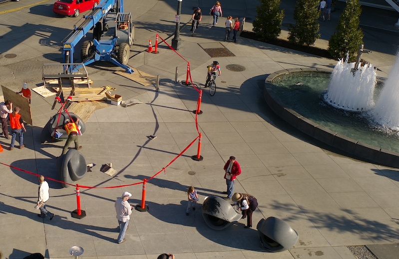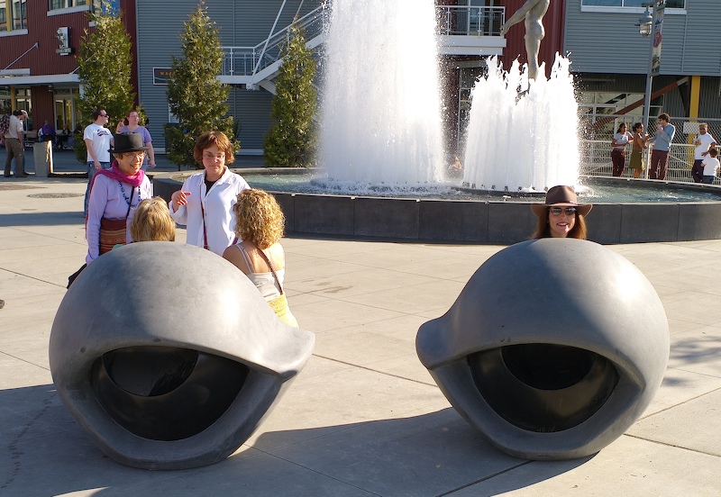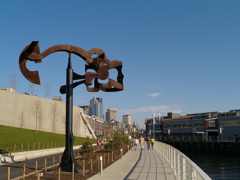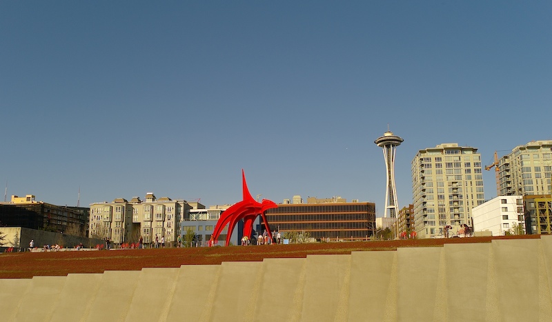 It was a nice, warm, sunny day in Seattle. Being next to the OSP is nice due to easy access to the sculptures and park. I believe that the installation of the Eye Benches completes the construction of the park.