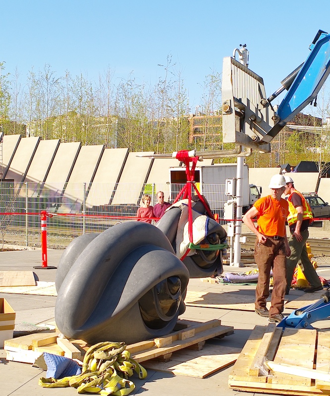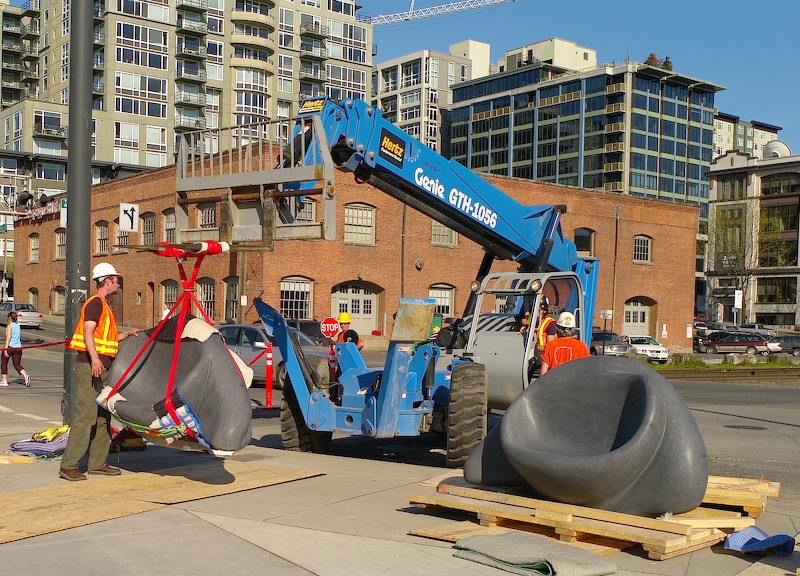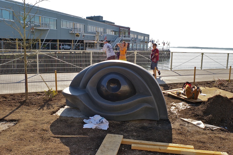 We live across the street from the Seattle Art Museum's Olympic Sculpture Park. The OSP has been under construction for years, but it is nearing completion. One of the last sculptures to be installed were the so-called "Eye Benches". These sculptures were a set of granite benches carved to depict eyes as well as allow seating. We could see the workmen installing the benches from our balcony, so we grabbed a camera and headed over to see the benches up close. The photos below are what we saw.