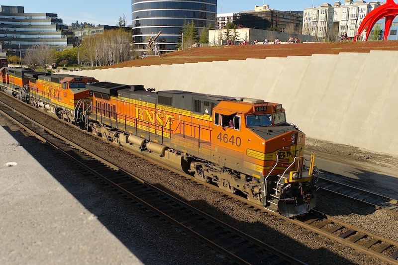 OSP also built a pedestrian bridge that allows crossing over the BNSF main line. Here a set of locos await orders to move south.