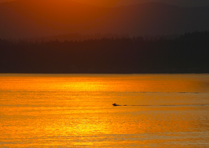 Lone pleasure craft crosses Elliot Bay at sunset. Bainbridge Island in the background.