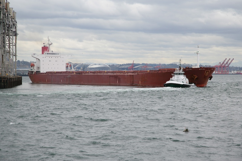 We live right next to Elliot Bay in Seattle. The location affords us a great view of the comings and goings of grain ships that take on cargo at the Seattle Grain Port just north of our apartment. One overcast morning (which is most mornings) I saw the tugs approaching the docks. This could only mean one thing -- a changing of the guard at the loading dock. So, I grabbed my 1Ds camera and bike and peddled north. The wind was strong and cold making it less that pleasant outside. The photos below are what I saw.