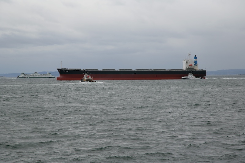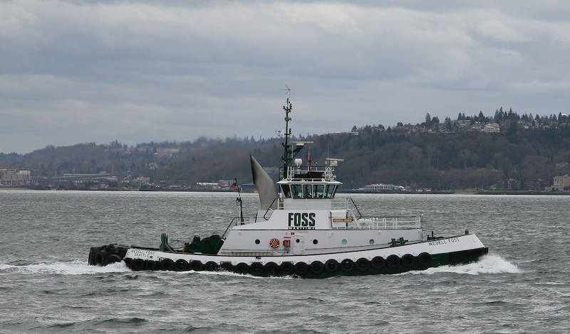 Done with the Babitonga, tug "Weddel Foss" prepares to assist Red Lily into position at the dock.