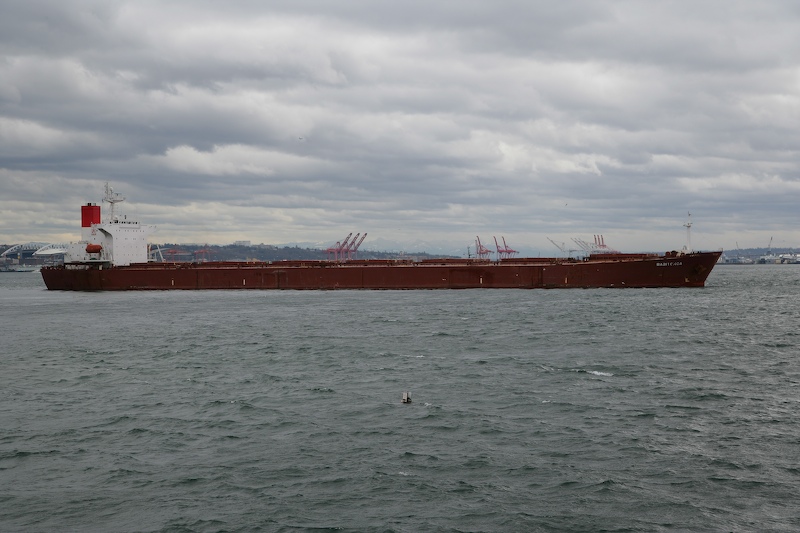 This was a cold, windy day which made being outside somewhat uncomfortable. But, adverse weather notwithstanding, it was cool to watch the team undock and redock a ship. The whole process took less than 30 minutes for both ships once the process got started. These ships are large and the loading process takes many days. When a new ship arrives at the terminal, it is greeted by a string of grain trains bringing cargo to load. It looks to me like it takes 5-7 train loads to fill a ship.