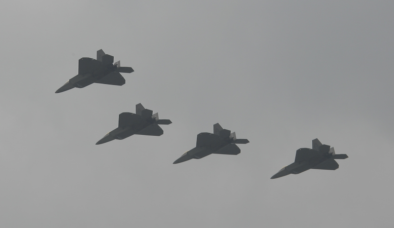 The national anthem was accompanied by a fly-by of a set of F-22 Raptor fighters.