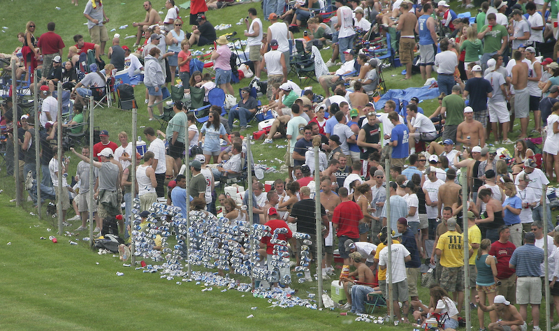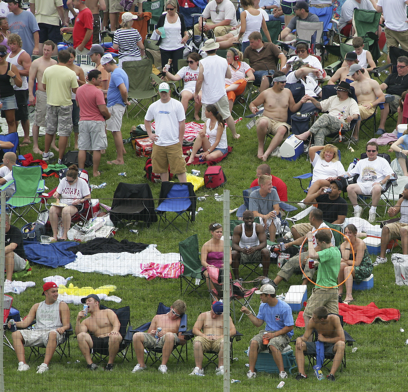 A view of the debauchery in the infield. Note the 2 fellows with the nodding heads in the lower center. These fellows are passed out and stayed in that position for most of the race despite the incredible noise of the cars passing less than 50 feet away.