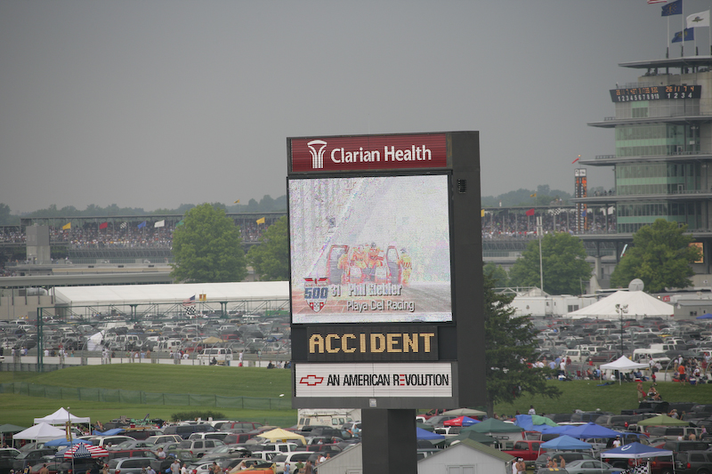 One of the early accidents. Milka Duno crashed her rig, but was uninjured. She was a favorite of the crowd since, like Danica, she is one of the few women drivers. And like Danica, very attractive.