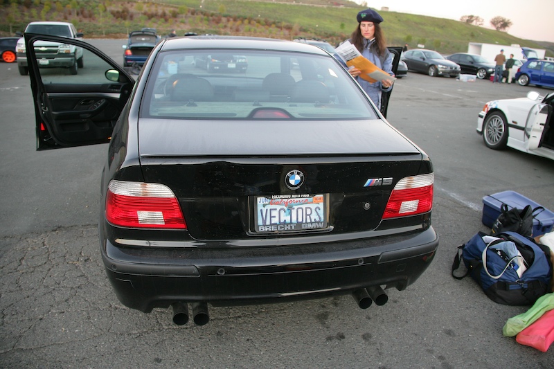 Ouch. Vectors is showing her age. If you look closely here, you will see 3 battle scars. The deck took 2 hits and the bumper one. The deck suffered shopping carts in the Von's parking lot as well as a plastic garbage can. The bumper took a shot in, of all places, the customer parking lot of Seattle BMW. The person was kind enough to back into me and then leave without a word. Thanks, buddy. Here, we are cleaning the goodies out of the car prior to the first run group. Note all the stuff on the ground to the right.