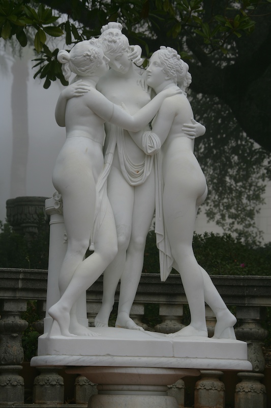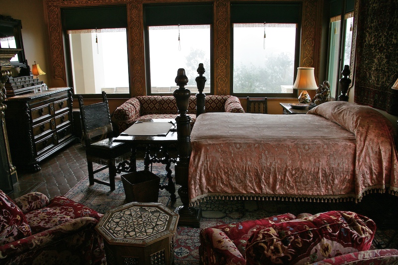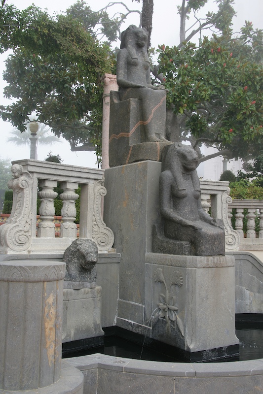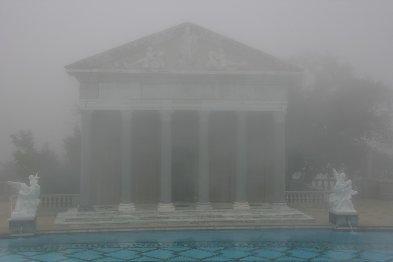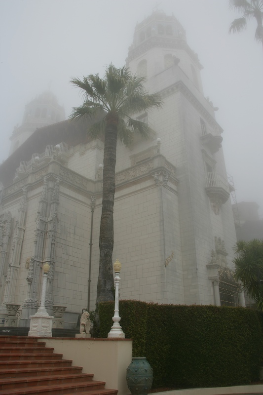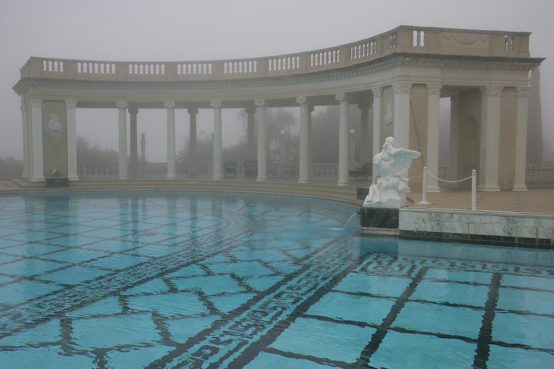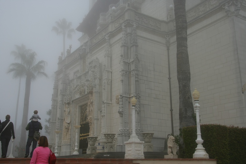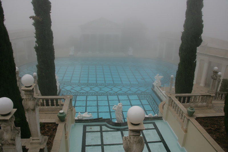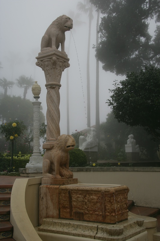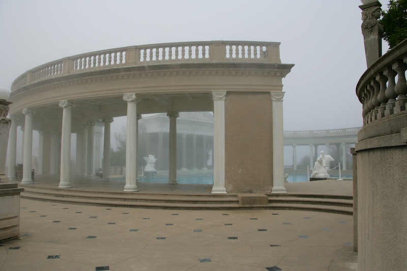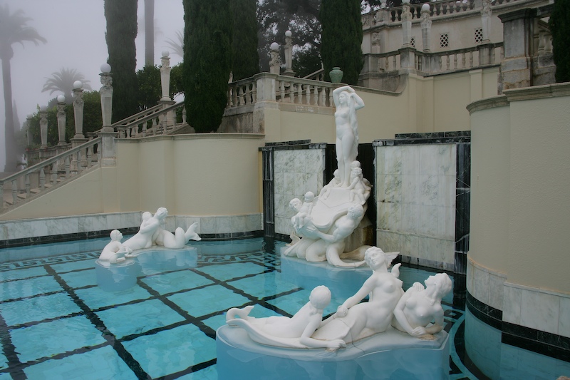 When we were finished with the bay area, we headed south to Monterrey to spend the night in an unmemorable motel. We had an acceptable dinner down on the Fisherman's Wharf, but nothing more. But, what did I expect? It is a tourist area after all. The next morning we headed south along Highway 1 with the destination being Hearst Castle. I had hear fantastic things about the site, but nothing I heard or anticipated prepared me for the reality of the experience. Sadly, the fog that day was heavy. So heavy in fact that during the bus ride up from the visitor's center, you could see NOTHING out of the bus windows. The visibility was so restricted that I was getting vertigo. I managed to contain the urge to barf and we got to the disembarkation area before it became critical. The entrance to the main area blew me away. Aside from some locations in Europe, I have never seen anything like this. So, rather than digressing into political comment, I will just stick to photos and light banter. It seems that W.R.'s daddy had become rich due to a small silver claim he had in the Sierra Nevada. That claim would later turn into the Comstock Lode, one of the biggest silver strikes in North America -- ever. When daddy-o was flush with cash, he bought a small ranch on the central California coast from the original Spanish land grantee. The ranch was 50 by 40 miles with one side being the coast. Since the ranch was remote, even with somebody with infinite funds, there was a bunch of infrastructure development that needed to be done. Roads, air fields, water storage areas, aqueducts, farms, etc. But when it was done, it was a fully self-contained world.