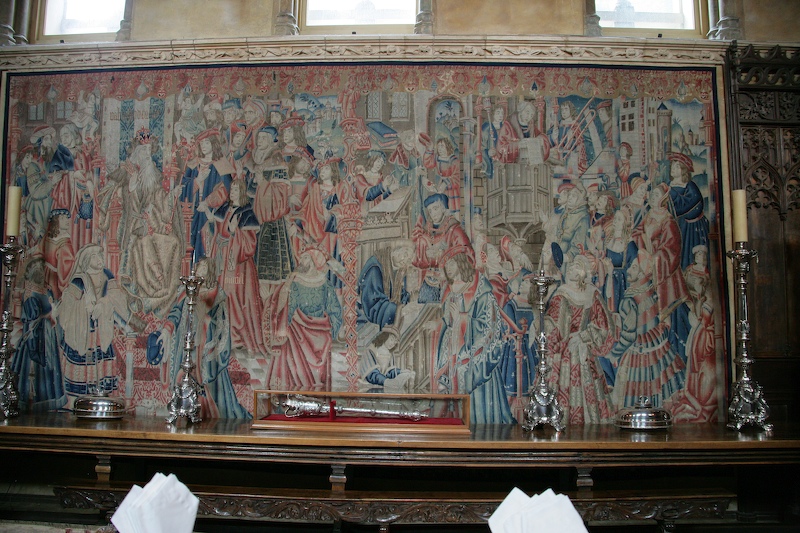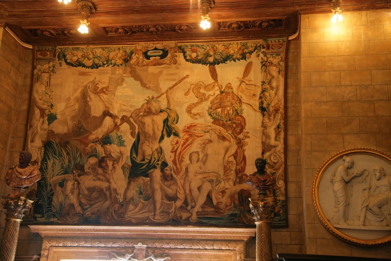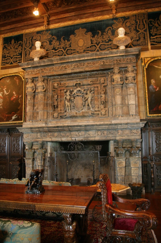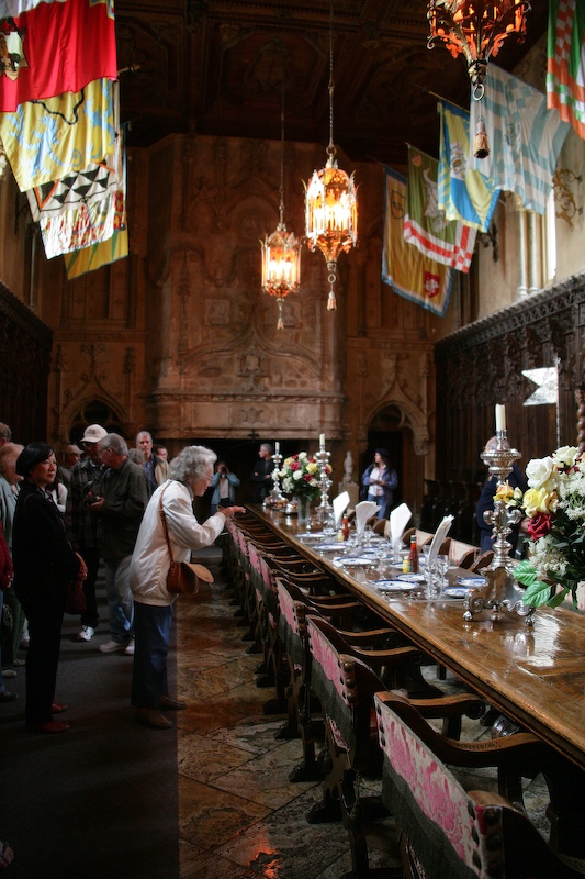 The main dining room complete with heraldic flags from Italy. The fireplace is on the far wall.