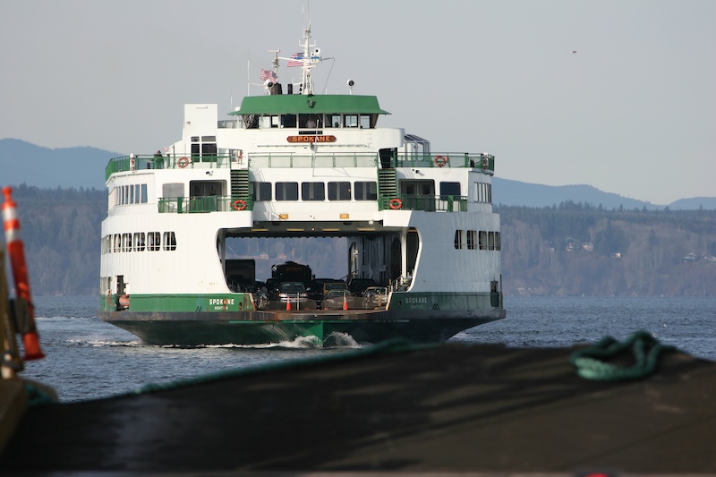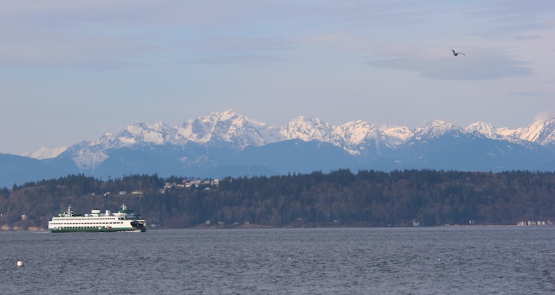 Just to be different, we decided to cross at Edmonds. Here is the ferry inbound to the loading terminal with a different view of the Olympics in the background.