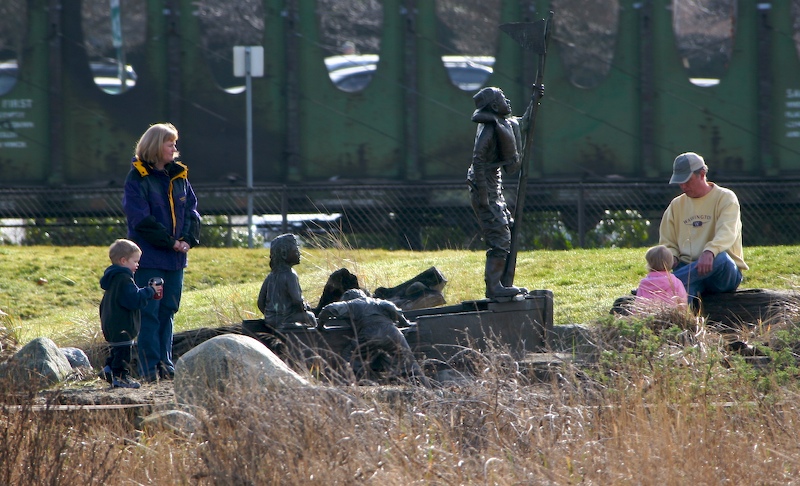 Next to the Edmonds ferry terminal, there is a beach with some interesting statues. Here a family plays next to one of them.