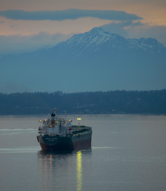 Early morning found the "Angelic Grace" anchored in Elliot Bay awaiting a load of grain. The Olympic mountains are in the background as is Bainbridge Island.