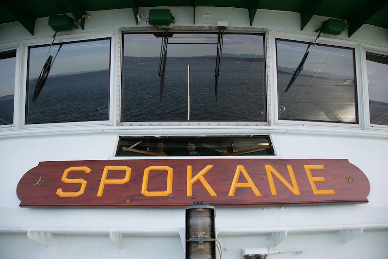 After we got underway, I got this shot of the captain and crew at work. They are visible in the lower window. You can also see the reflection of the Olympics mountains in the distance.
