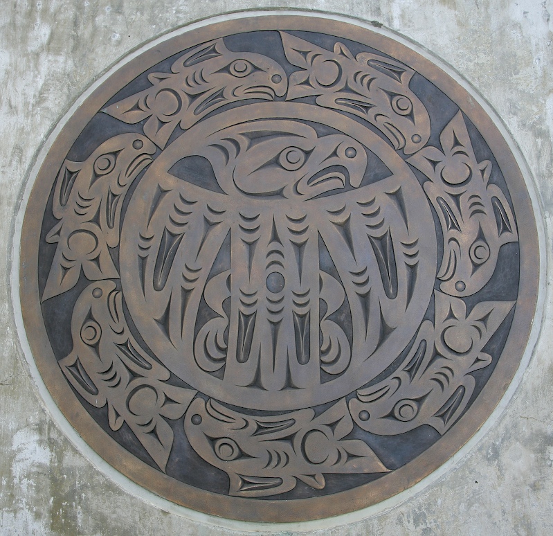 We traveled on state route 104 through Port Gamble to US 101 and then from there to a small town called Blyn. This is the home of the S'Klallam tribe. We stopped at their visitor center and saw this cool bronze plaque of an eagle surrounded by salmon.