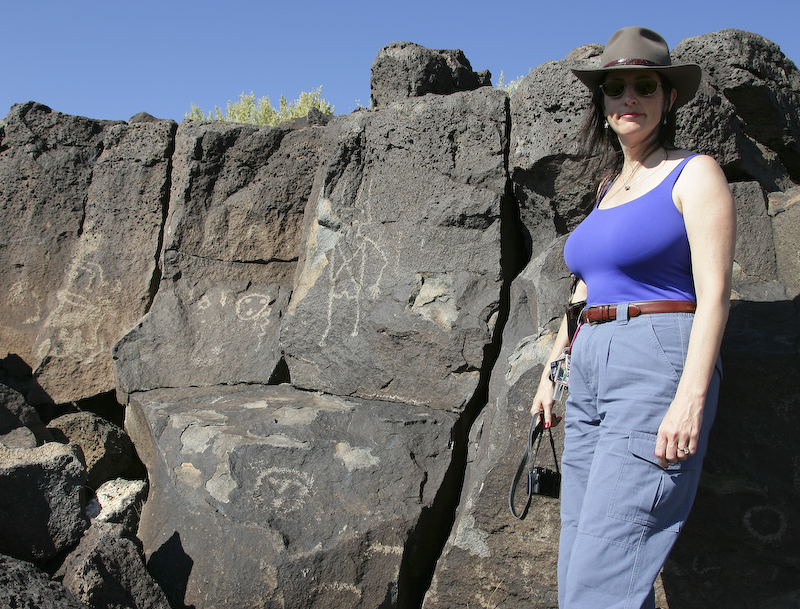 The site is on a hill on the west side of town near the Rio Grande river. There was a substantial climb to get to the top of the area. Here, Kathleen negotiates the steep and narrow trail on the way to the top.