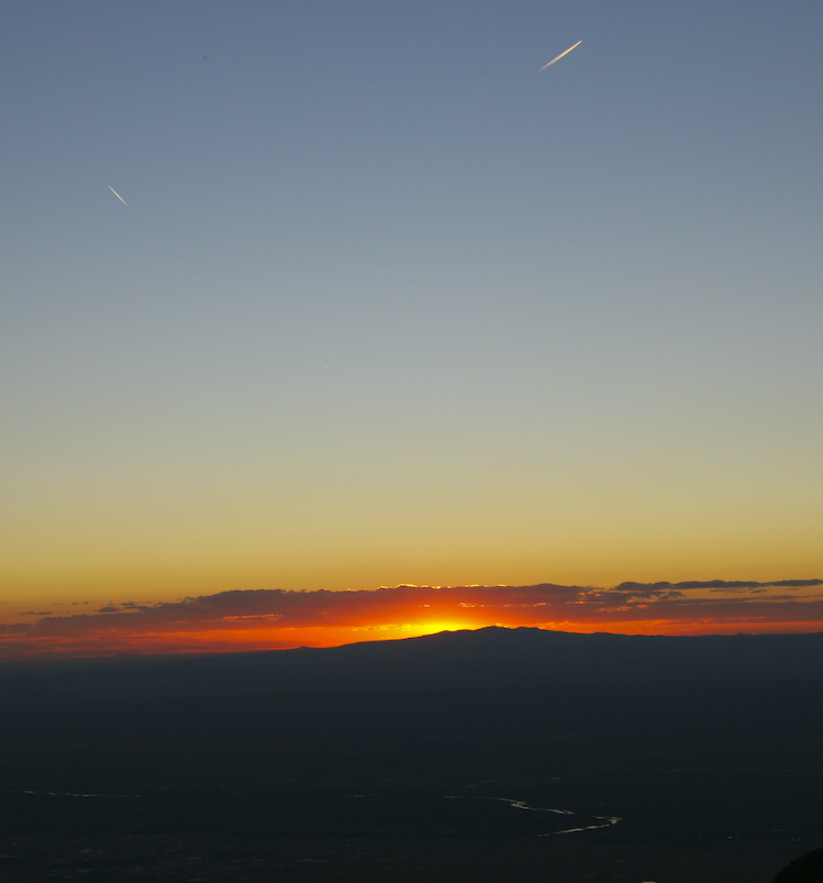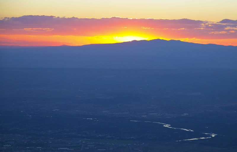 We were on the peak at sundown, but the sunset was not all that impressive by western standards. Note the Rio Grande river at the lower right of the photo.