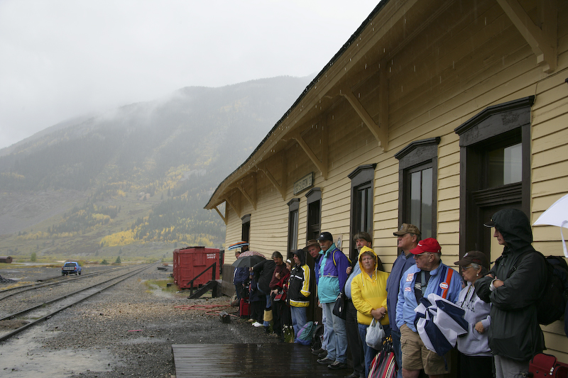 It was raining hard so most of the folks were crowded under the eaves of the Silverton station.