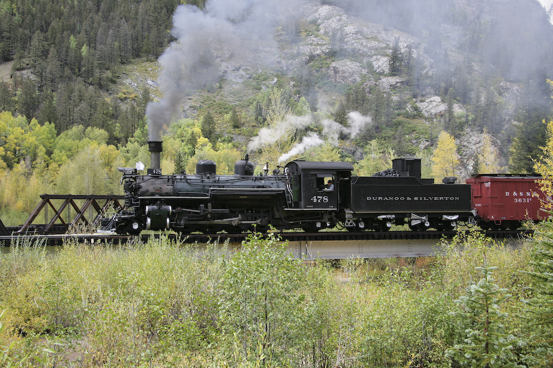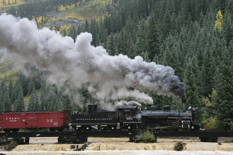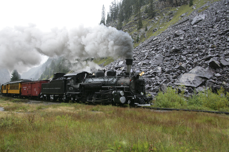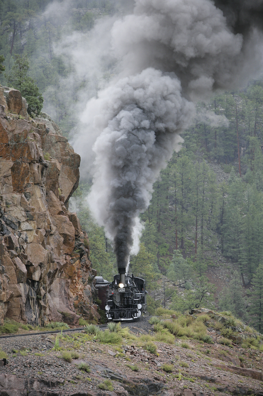 We had planned our trip to travel on the Durango and Silverton Narrow Gauge Railroad for many months. The train travels in the Animas River canyon which is both steep and narrow. The DSNGRR runs old narrow gauge steam locomotives that were part of the Denver & Rio Grande line. Most of the locos have been in continuous service since their construction in 1923. We signed up for the photographer's special trip that allowed the passengers to get off the train and have the train do a "run by" thus allowing photos. Since this was a special trip, we only traveled down hill from Silverton and therefore had to take a bus from Durango to Silverton at 0700. Sadly, it was raining heavily nearly the entire trip resulting in flat lighting and totally soaked clothes. I am happy to report that my Canon 1DsM2 camera is claimed to be "weatherproof" and I concur with that claim. It rained heavily and all the equipment was wet in addition to the passengers. Many of the other photographers reported damaged or failed equipment due to the moisture. I was not one of them.