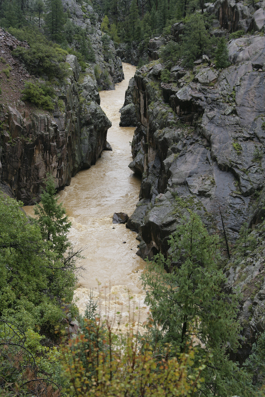 We cross the Animas river for the first time of the day. It had been raining heavily all night; note the color of the water. It is carrying a full load of silt.