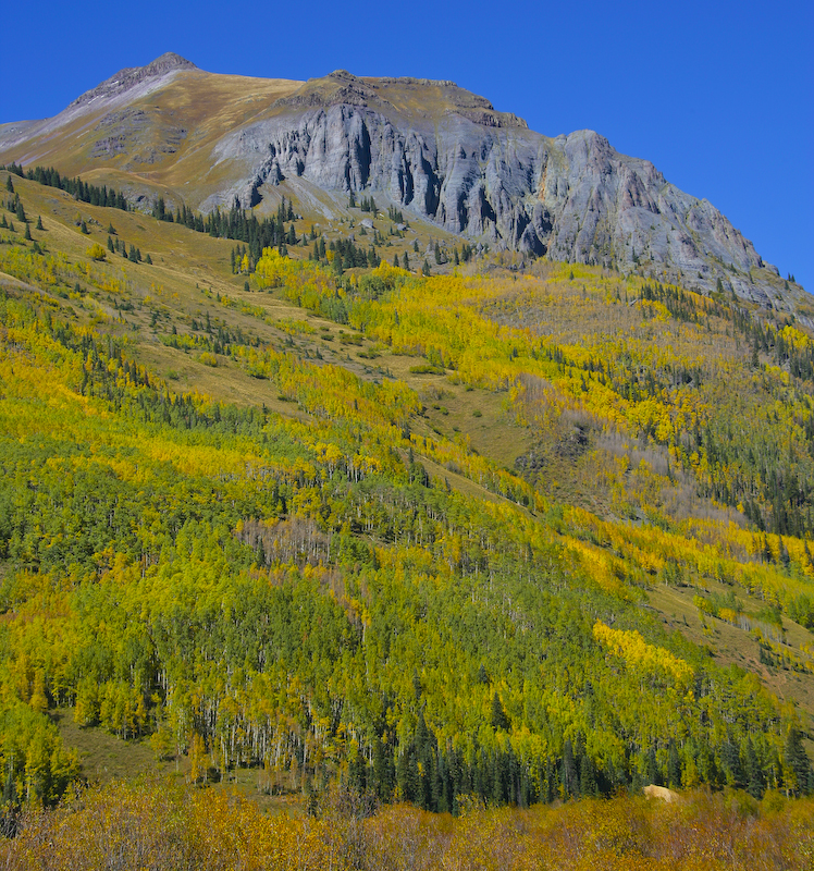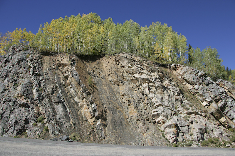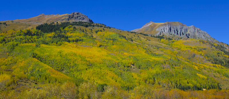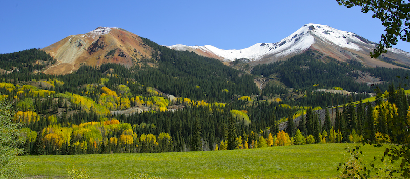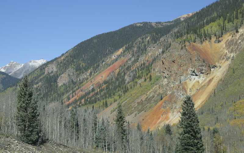 The mountains around Silverton, indeed the entire San Juan range are heavily mineralized due to the volcanic activity and uplift. That mineralization results in the rich colors in the rocks. The mineralization is clearly visible on the flanks of this mountain as seen from the Molas Pass downgrade.