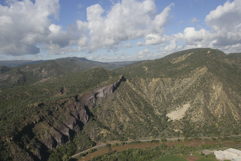 One of the uplift structures just to the south of Durango. Mine tailings are visible on the right side of the photo with the Animas river in the foreground.