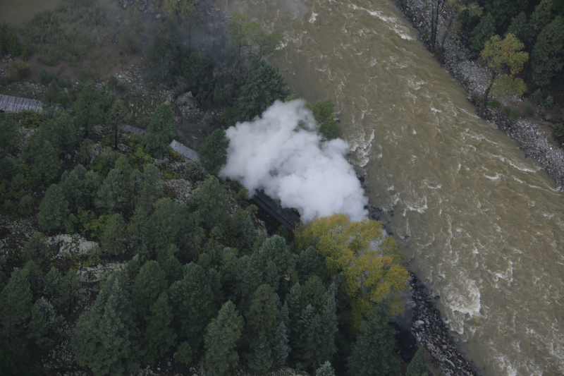 We overtook the train on our helicopter ride. Since this train was carrying extra cars, it had twin steam engines.