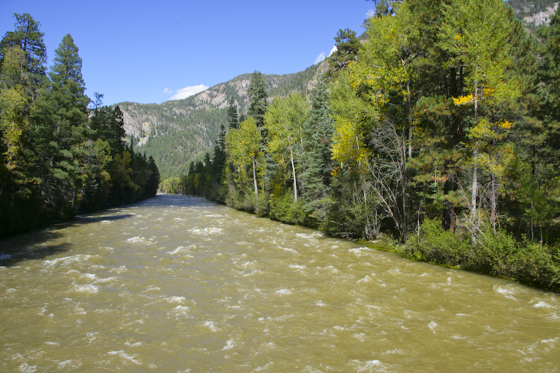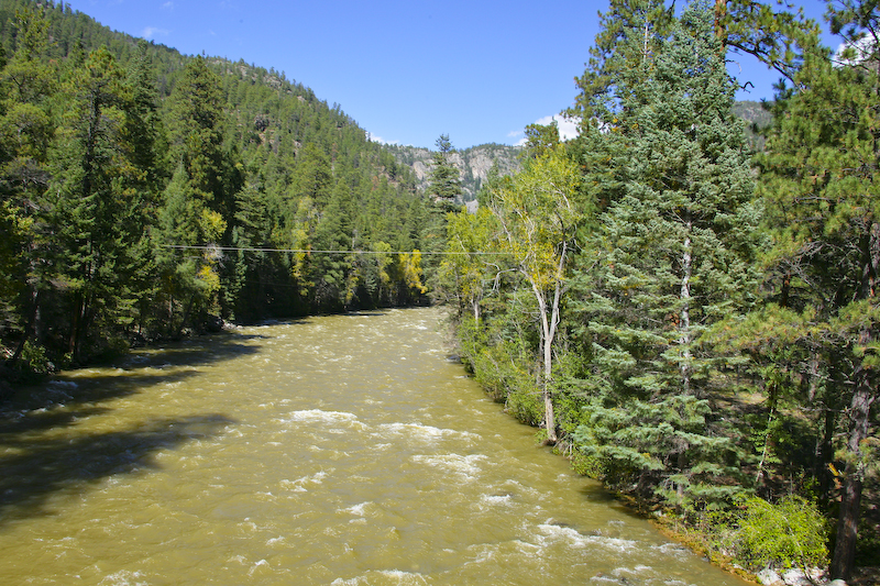 I took this shot as I crossed the Animas River. Note the other line in the distance. The river was still high from the rains on the day before and while the color was much more subdued, it was still colored yellow from the high silt load due to the runoff.