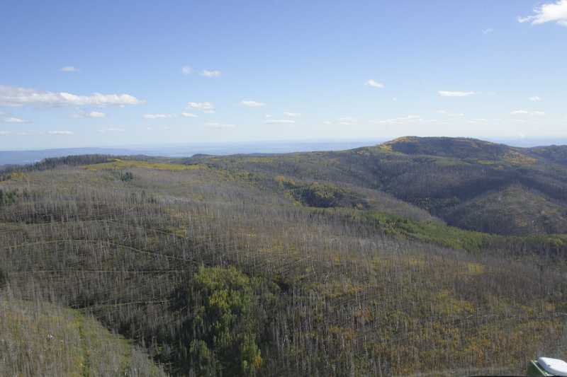 This is Missionary Ridge just north east of Durango. There was a large fire here in 2002 that threatened the city. Here, you can see the burnt trees. But despite the fire, the land is growing back nicely. The helicopter pilot stated that the Fish&Game folks measured over a 1000 "extra" elk in the region due to the additional grasses as a result of the additional sunlight. The object in the bottom right of the frame is in the cabin of the helicopter.