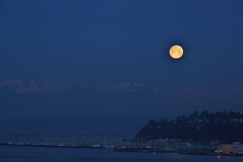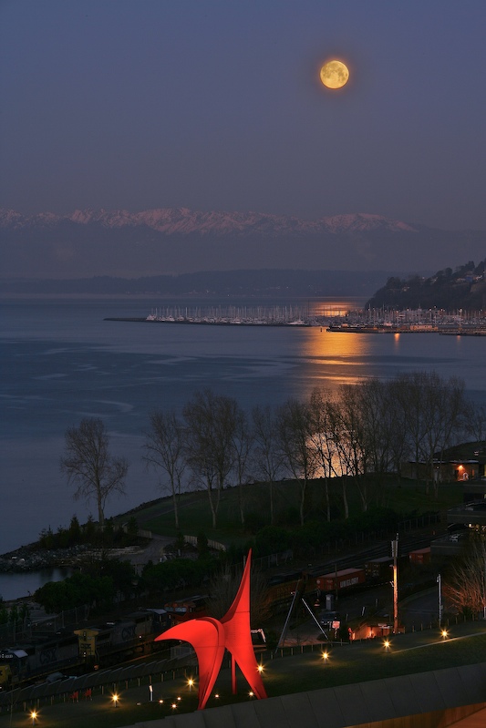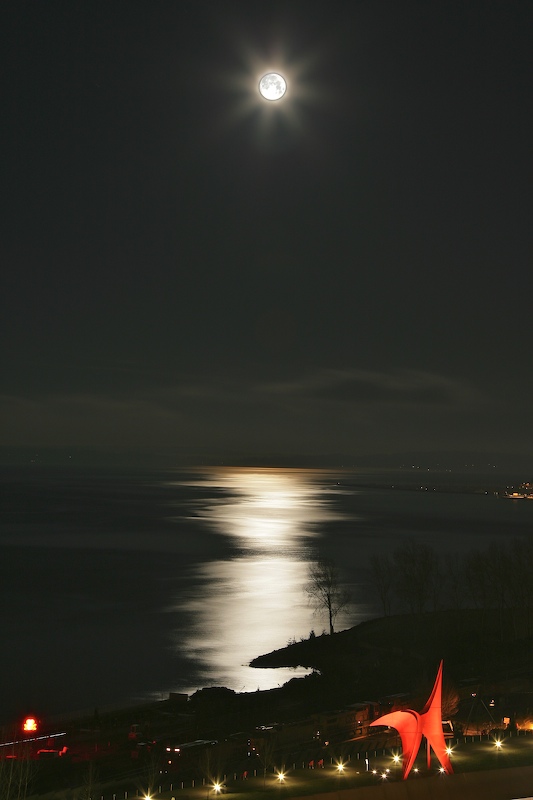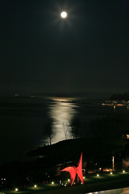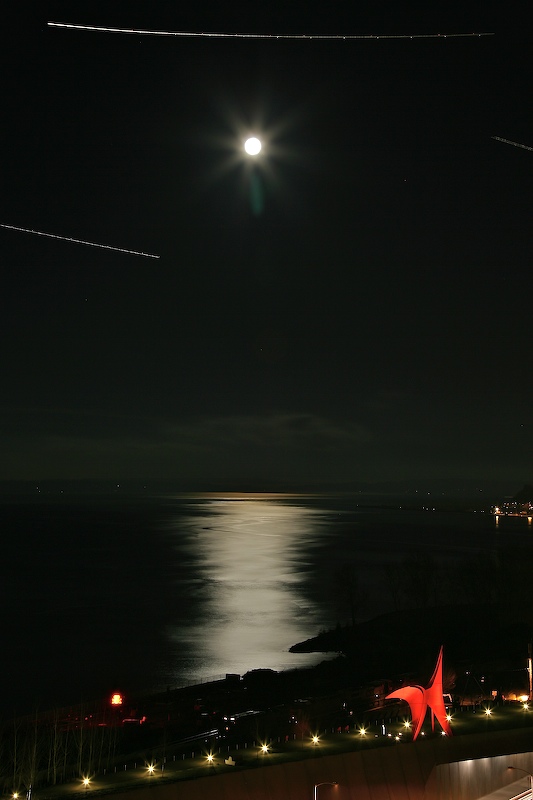 This shot is pretty good technically. Good depth of field, but then I set the camera to f/14 to get exactly that effect. While the moon is "blown out", that is generally to be expected. The baseline moon is about 1/125 at f/5.6 plus or minus a bit. The balance of the scene meters at 15 SECONDS at f/14. Hmm that must be about 15 stops of dynamic range, so something has to give. I elected to get the background rather than the moon. But, there were other factors that I did not consider. Notice the trails? These were aircraft on departure or approach to SeaTac airport. The pulses are their navigation lights. These were not on the menu, but it made an interesting side dish. Also, the very long exposure totally blurred out the wave action on the bay. But, to the camera's extreme credit, there is minimal ISO and exposure noise. Note the exposure of the passage under the bridge and "The Eagle" sculpture. And note the stars in the sky and clouds. Very impressive. Lesson: think about things that could appear in the scene before they happen and look for them before they happen.