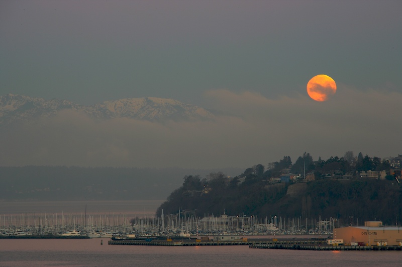 On most topics, I consider myself to be "trainable". That is a good thing, otherwise I would have have committed some unspeakable act(s) due to frustration. Taking shots of the moon, at night, with other lights nearby is quite difficult. Recently, we had several nights of remarkably clear weather (for Seattle). On the first day, I got out of bed a bit late. When I walked into the living room, I saw a great view of the moonlight reflecting off Elliot Bay. Recognizing the opportunity, realizing that these scenes last only moments I sprung into action. Gladly, my equipment was close, so I hustled to set up the tripod and camera on the balcony. If you note the date on this post, you will realize this was during the dead of winter. Knowing that time was short, I attempted to take shortcuts to get setup while the scene was at its peak. Forsaking shoes and a coat, I had the kit assembled and began shooting.
