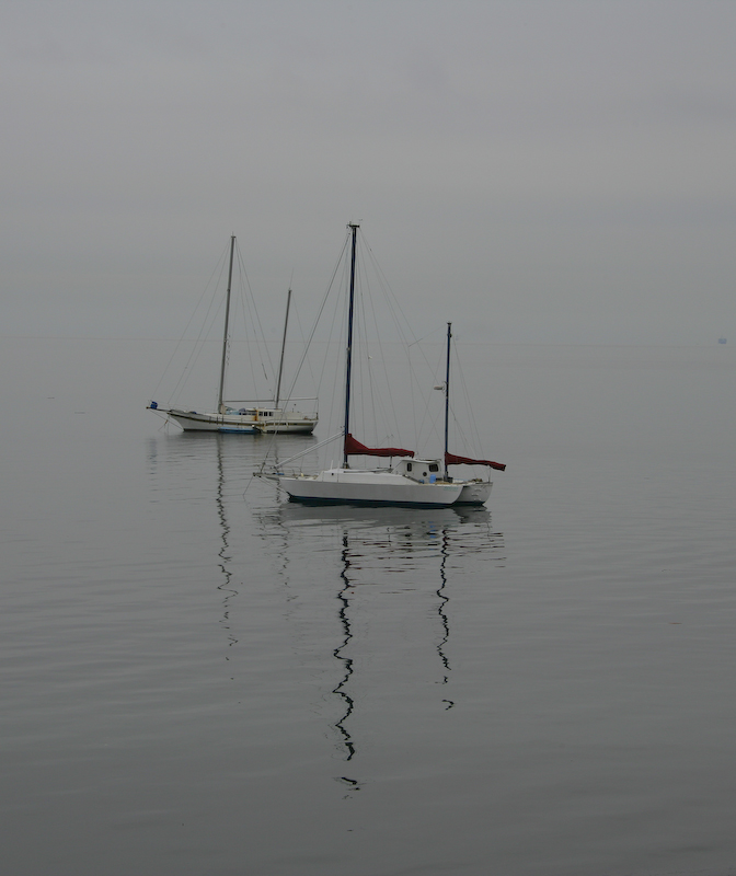 The balance of the trip to Port Angeles was uneventful. We researched the area using the AAA tour guide and found a nice french restaurant in Port Angeles. We arrived at 9pm and there was precisely one other couple in the restaurant. The owner's wife was the cook and the food was very good. The special was Veal Normandy and the wine was Bordeaux. Nice combo. The next morning, the weather was very overcast (which is normal for the northern Olympics). I saw this pair of sailboats moored in Port Angeles bay. We weather was very calm, note the clear reflections of their masts.
