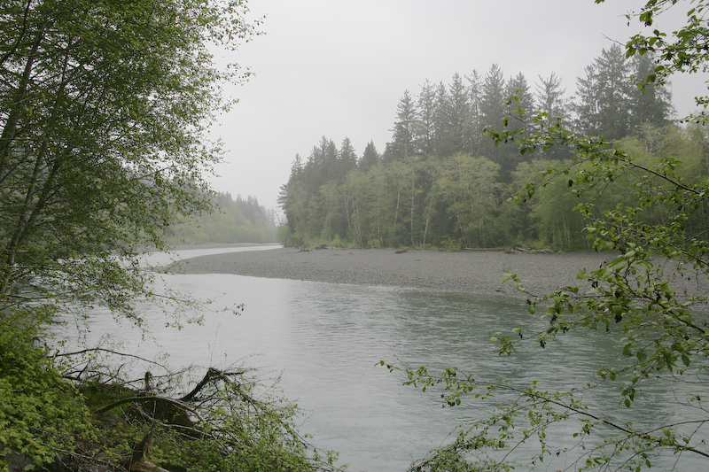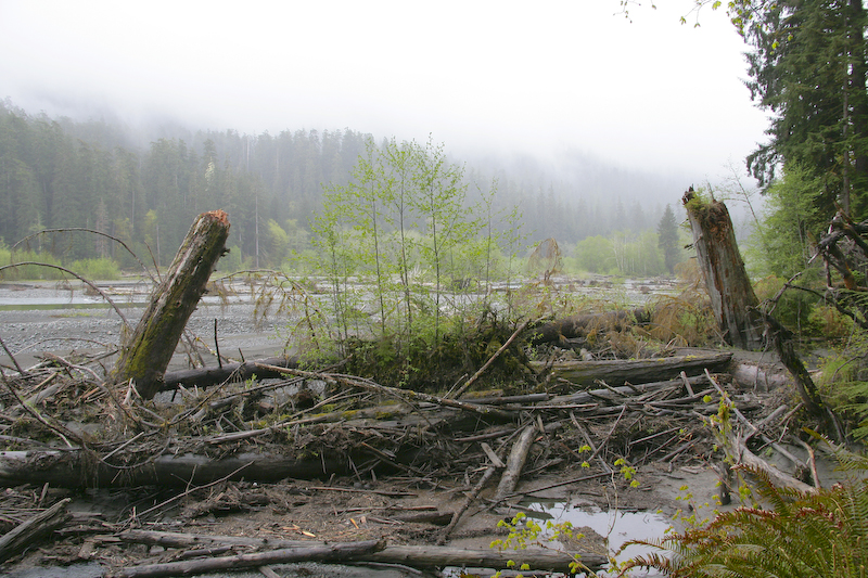 A view of the upper Hoh river. The river level was low, but it was much higher recently. This area gets 140" of rain annually and during the spring melt, the runoff is high. Note all the debris packed near the river bank.