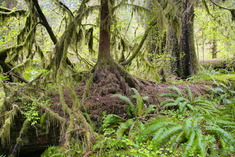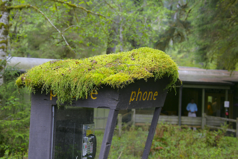 The Hoh rainforest supports a variety of epiphytes (plants that only need air and water). Literally, every available space was covered with moss, fungus, lichens, etc. Here, the top of the phone booth has been taken over by the local epiphytes.