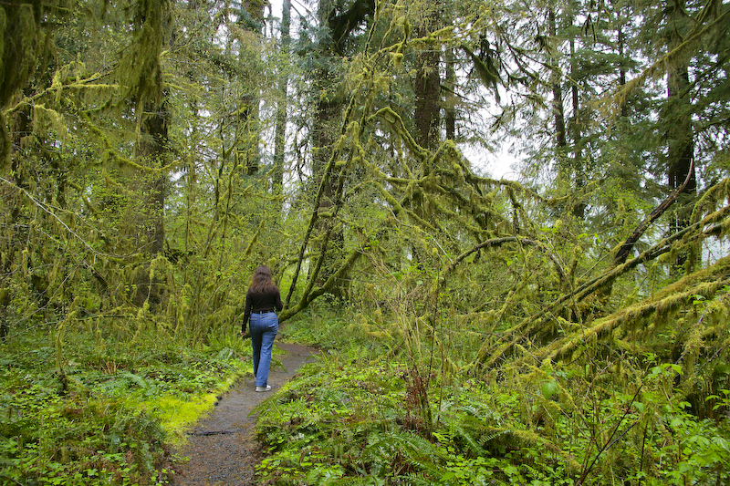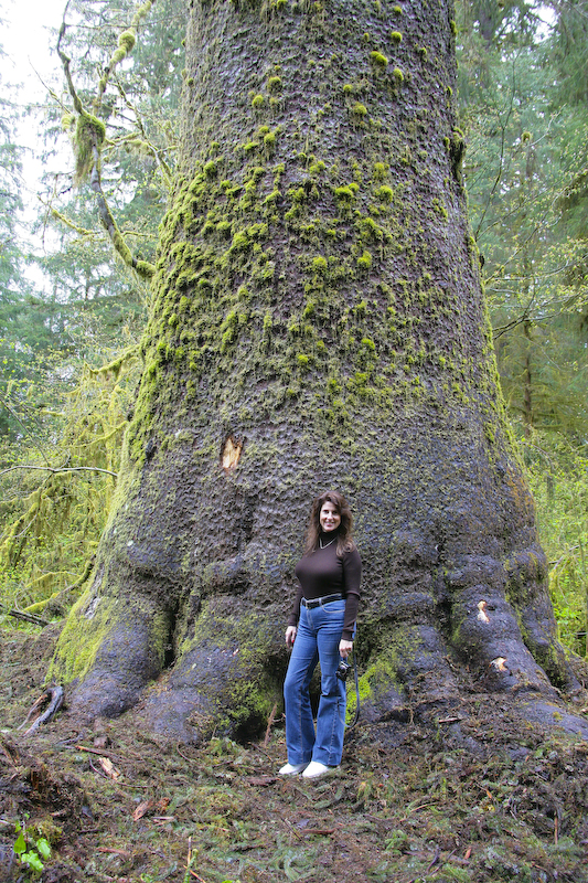 There was a viewing area for this very large cedar tree. Here, Kathleen poses near the tree to provide a sense of scale. The Hoh rain forest supports some of the largest trees on the planet due to the abundant rain.