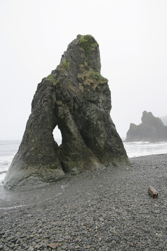 This stack had a nice hole eroded through the center of the stack. The weather sucked, so we climbed the hill back to our cars and made a speed run to the Quinault Lodge for the night.