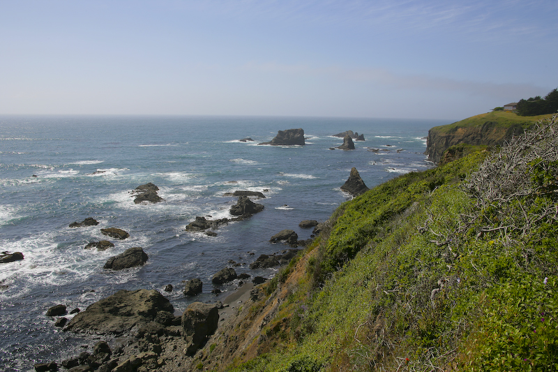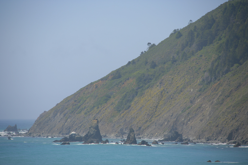 This portion of the coast is not quite as rough as Oregon, but still has the same basic structure with large headlands and sea stacks. There are a large number of small stacks at the foot of this cliff.