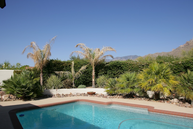 My father fancies himself as a horticulturist. As such, he takes pride in his plants. But, recent cold weather and recurring freezes in the Tucson area have nearly killed his Queen palms in the back yard. Note the dead fronds on all three Queen palms. Gladly, none of the more hardy Mexican, Sagos or other palms suffered as badly as the Queens.