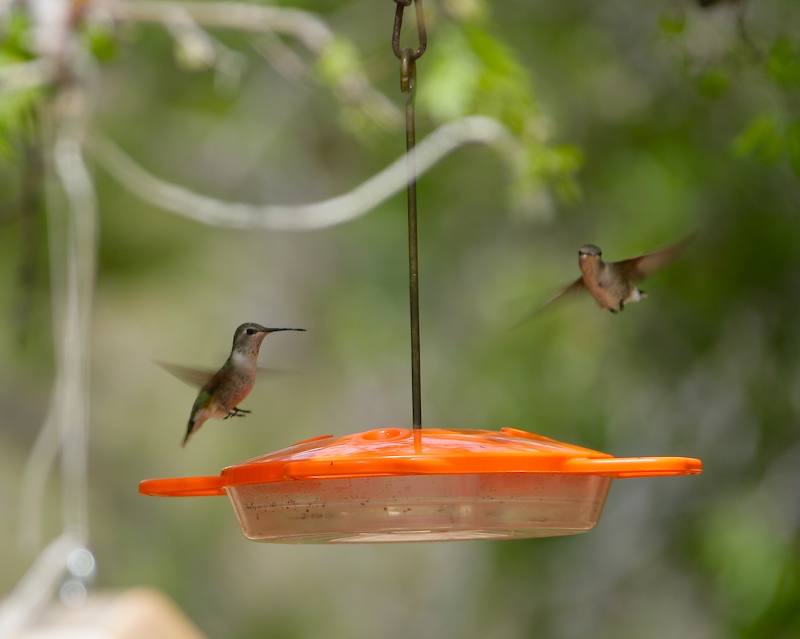 On our second day, we visited a long time friend in Oracle, AZ. Her place is "in the boondocks" and is therefore blessed with lots of wildlife. Sadly, since her place is near a wash, she also gets flash floods (as documented on my site in 2003). Above, her hummingbird feeder attracts a large number of birds of many species. Here, Kathleen was able to get 2 hummers at once inbound to the feeder.