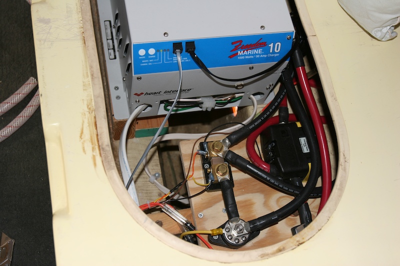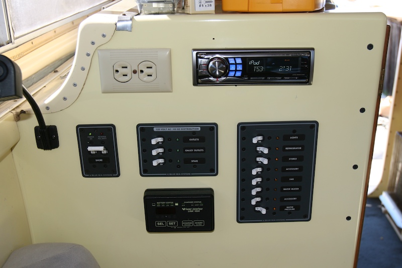 After the power converter and associated wiring was installed, I installed the power control panel and stereo. The top two items in this photo are obvious - an AC power plug and an iPod-capable stereo. Below is the 30 A main shore power breaker, the individual AC circuit breaker/switch panel and the DC circuit breaker panel. The panel on the bottom is the remote control for the converter-inverter. The remote panel also measures cumulative amp-hour usage of the batter array to assist in power management.