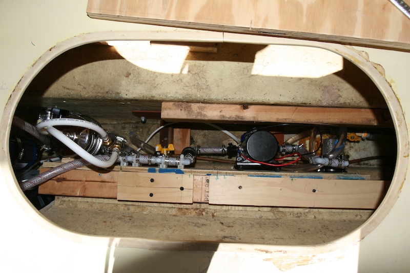 Under the other seat in the dinette, I mounted the new plumbing. Jed (my name for the hillbilly owner) had done a really rotten job of plumbing, so I ripped it all out and re-did it. I have a 3 gpm demand pump that feeds twin water filters. The first filter is used to strain out "the big stuff" when filling the tank. The second filter, visible on the left with the white hoses, is a bacteria and virus filter that provides great tasting water from the on-board tank. The water is as good tasting as bottled water and just a bit better than our reverse osmosis water at home. We can, if need be, fill the on-board tank with contaminated water and rely on the filter to clean it up. All the plumbing is mounted on plywood that will allow removal of the entire sub-system should that be required. I hope not as the plumbing was much worse than the electrical in terms of cramped conditions.