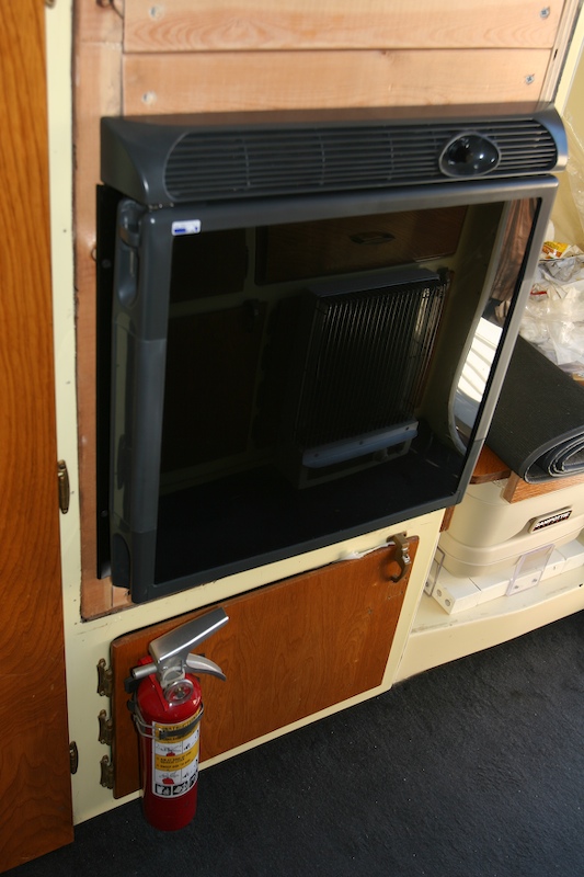 I also ripped out the old propane-based refrigerator. I never did establish that it worked because it did not matter. You cannot run propane when you are in motion, so it was a non-starter. I replaced it with a Norcold 2.1 cu .ft. 12V/120V unit that will operate 30 degrees off level. This unit has a bigger internal capacity than the unit it replaced but the footprint is smaller which required a bunch of woodwork to get the mounting robust. The 2 2x4s that comprise the face plate are visible at the top of the photo. Also visible is the portipotty and mounting on the right side of the photo.