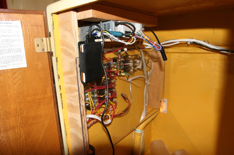 This photo shows the back side of the breaker panels and the mounting for the stereo. A cut and installed a plexiglas panel to provide mechanical separation and protection for the wiring. The iPod is hanging in the pouch.