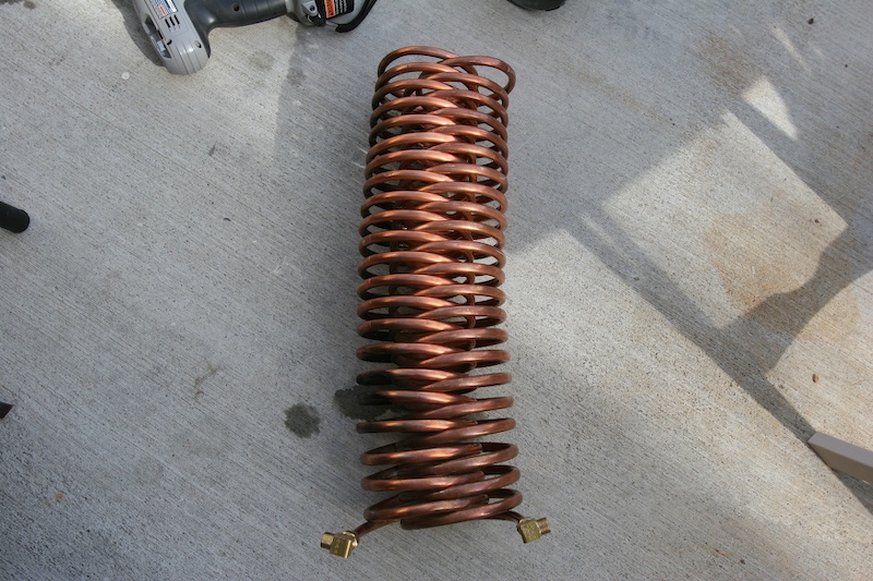 To fabricate the coils, I purchased copper tubing and fittings at the local hardware store. I mounted a small propane bottle in my vice and used it as the mandrel for the bending. Bending the tubing was easy and only took 10 minutes or so per coil. The photo below shows the completed heat exchanger assembly with the interlocking coils.