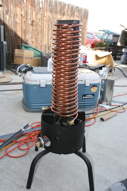 There are still actions to complete, but most of the big stuff is complete. Like most of these tasks, it was more work and more expense than expected, but it has proven worth it (so far). One of the items that was on the list but not yet constructed was a water heater. I looked at the commercially available propane-powered "flash" heaters (i.e. a heater with no hot water storage tank) and they were wimpy. Those that we of sufficient thermal capacity did not provide sufficient water pressure/flow or had poor temperature control. Since idle hands do the devil's work, I decided to design and build one myself. The short story is that the design called for inter-locking helical coils and about 50 feet of 1/4" ID copper tubing, a powerful burner and a frame/sleeve assembly to encapsulate the assembly. The photos below show the essential parts of the heater.