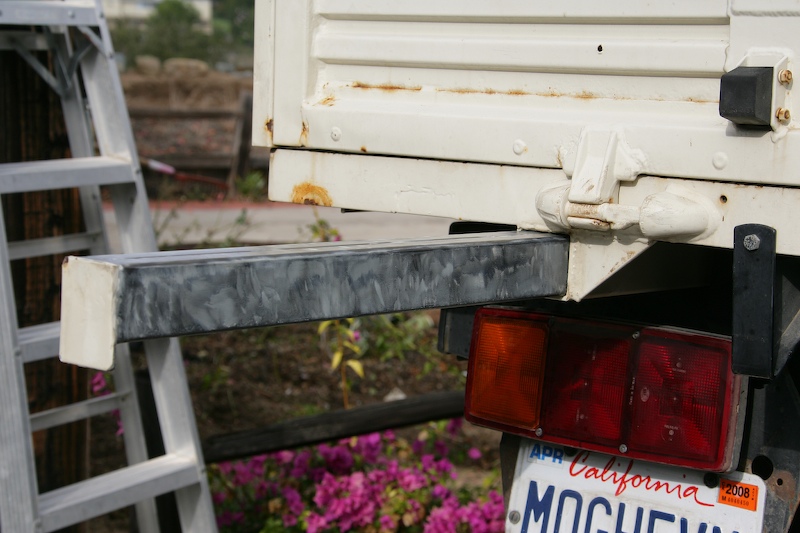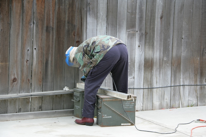 The mog came with these nice spars that extend out from the frame to allow the tailgate to sit horizontal. But, when I had the frame powder coated years ago, the coating made easy use of these impossible. So, the only solution was to remove the powder coat. Here Kathleen gets up close and personal with Mr. Angle Grinder with wire cup. It took her several hours per spar to get sufficient coating removed. That stuff is quite robust.