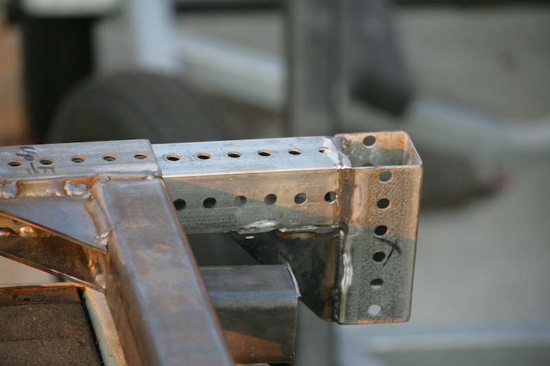 A view of the corner components before assembly. Note that the bed walls are up. The part on the right will be turned upside down before being welded into place. The part with the holes will act as the receiver for the lifting assembly.