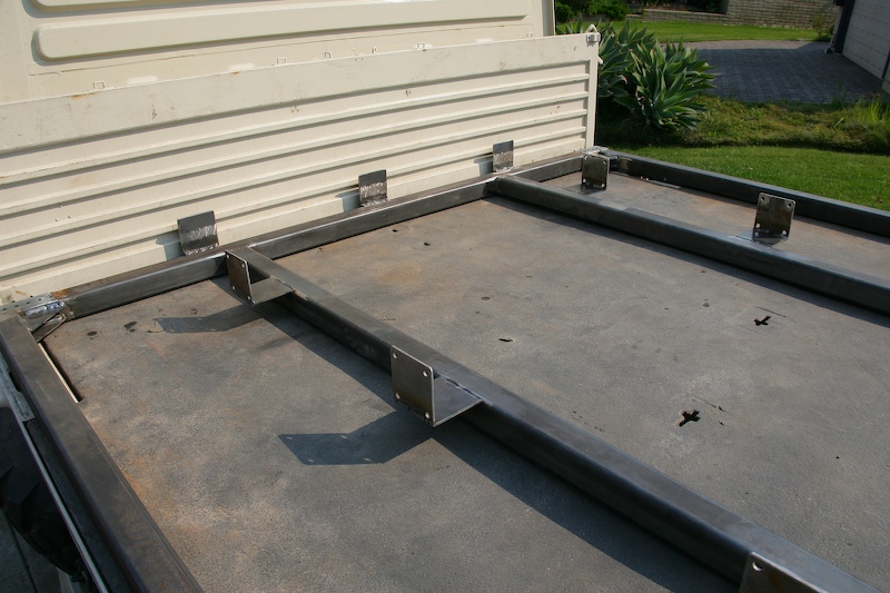 One critical design issue is getting the frame aligned on the mog bed, both initially and after removal. Since the bed had a number of attachment points and lined holes (for cargo canopy hoops), I used these holes as the registration points. At the steel store, I found these hemispherical cups that just fit into the hole, thus providing a way to allow the parts to mate. When positioned to within one radius of the cup, the frame will self align. It works good.